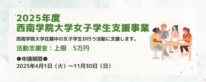 西南学院大学女子同窓会は、本学の在校生女子学生が、女子部活動で全国大会に出場する場合や、女子学生が中心となって行うボランティア活動に対し、上限5万円まで活動支援金を交付します。